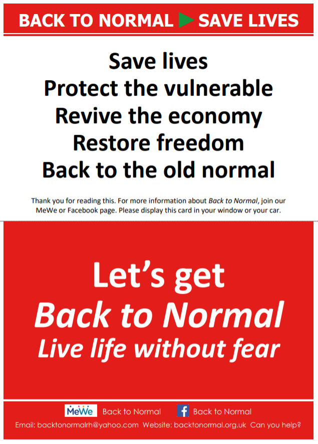 If you are feeling helpless, don’t forget the Back to Normal campaign; a ‘peoples army’ of delivery men/women distributing simply and powerfully worded anti-lockdown postcards across the UK. We’ve posted over 400,000 now and have formed multiple local informal groups and friendships in the process. And the tide is turning slowly – more and more recipients are getting back to us asking how to get involved because they thought they were alone in their scepticism.