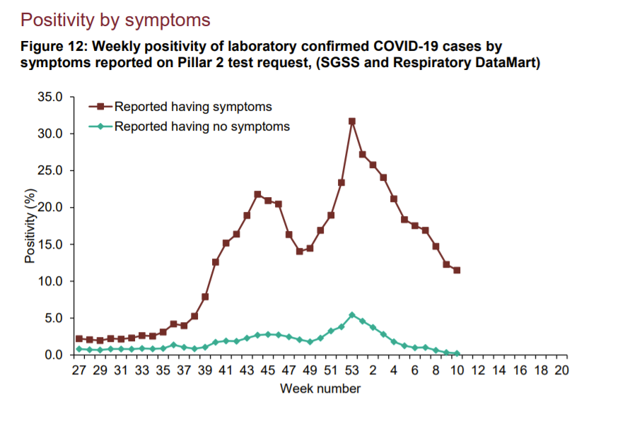 The “fact check” does not provide any sources for its claims that cold positives are “unlikely to have a significant effect on the number of cases” and that “people tend to have a test when they have symptoms”. In fact, about 12% of those who have symptoms and get tested are testing positive at the moment (see graph below), whereas overall positivity for Covid tests is around 2%. That suggests that the large majority of tests (around 83%) are being done on asymptomatic people.