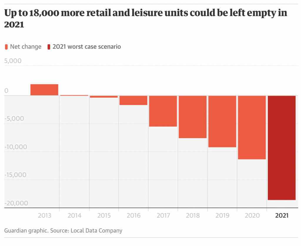 A new study has laid bare the devastating impact of the lockdowns on the British high street. Over 11,000 outlets permanently closed in 2020, and the Local Data Company (LDC) expects that this will be followed by 18,000 more closures in 2021. The Guardian has the story.