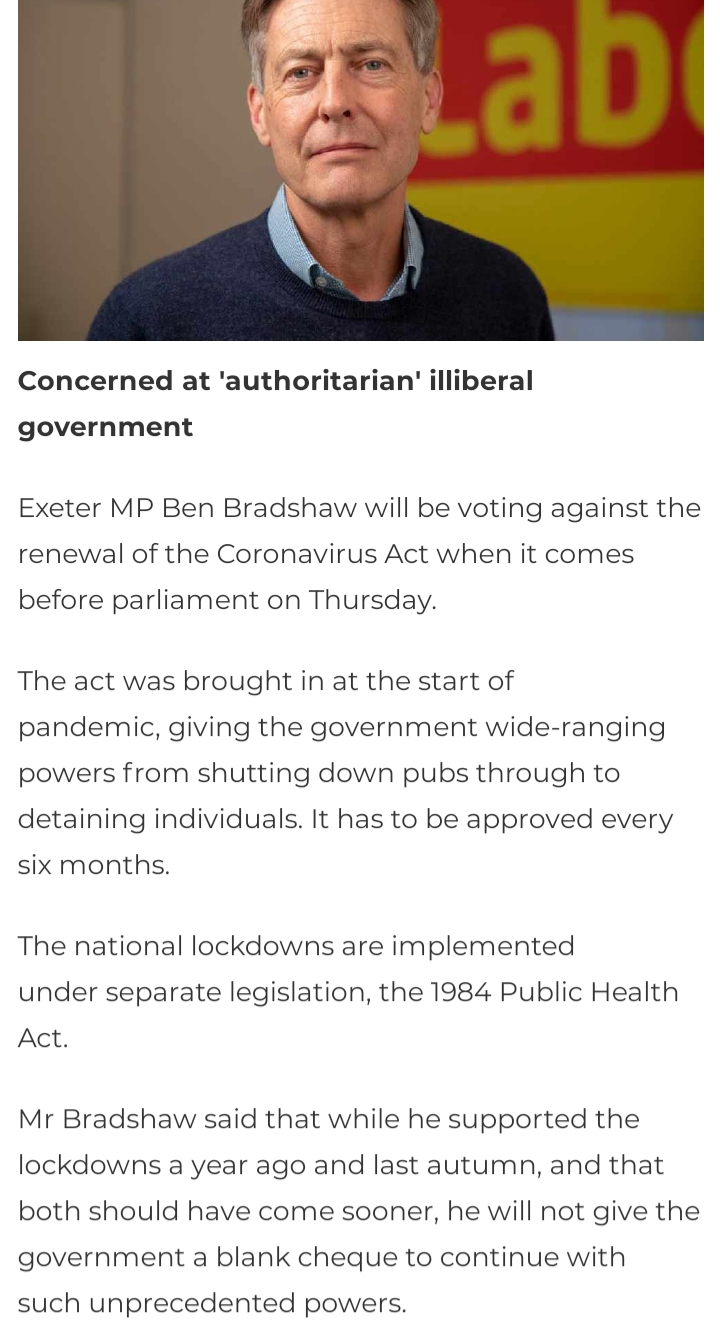 After 12 months ‘opposition’ to the bozo, hancock van tam claque by demanding ‘Sooner, Harsher, Longer Lockdown’ veteran Labour MP for Exter Ben Bradshaw has announced that he will not be voting to renew the Coronovirus legislation because
