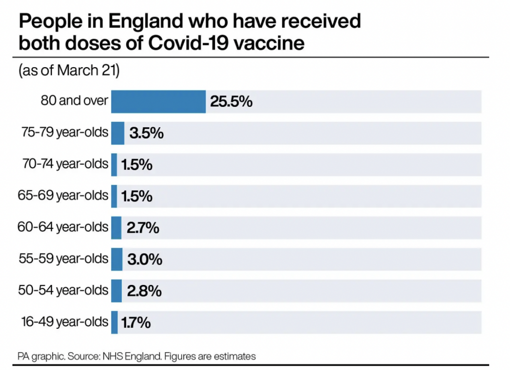 A small number of younger adults in England are now fully vaccinated, including 2.8% of 50-54 year-olds and 1.7% of those aged 16 to 49.