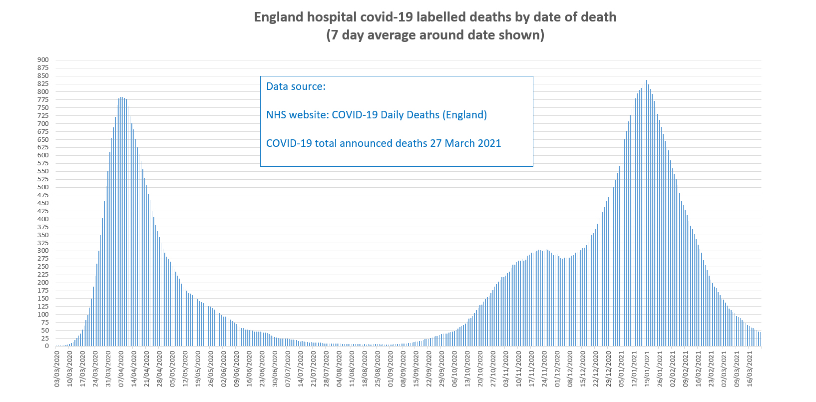 In terms of data it is much better to work with deaths by date of death as changes in reporting delays make death by data reported impossible to interpret One of the cleanest datasets to see trends in is English hospital deaths by date of death. Here is the chart of English hospital deaths by date of death (averaged over 7 days). It’s a wonderfully smooth curve and very instructive. I’ve only included deaths up to 25th March and allowance is made for deaths that have occurred but not yet been reported, but because most deaths up to 25th March have been reported the error in estimating those unreported deaths won’t really affect the curve. It’s worth saying these are covid labelled deaths (i.e death with or from). It’s wrong to assume this chart shows there was a second wave as big as the first, as what we are seeing this Winter is the normal seasonal increase in mortality in Winter packaged up as covid. That doesn’t mean that covid isn’t real, and it doesn’t mean it hasn’t been a harsh Winter mortality wise. It just means that pretty much all Winter respiratory illness is labelled as covid. This may… Read more »