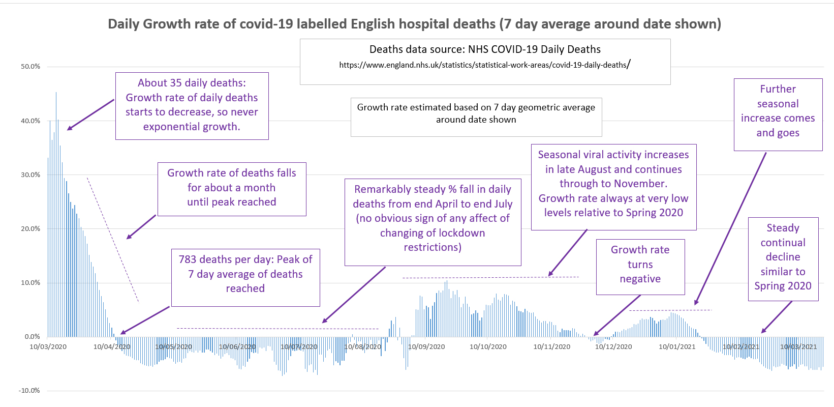 It’s not just that infections peaked before lockdown, but the growth in infections was reducing as far back as February when very minimal measures were in place.
