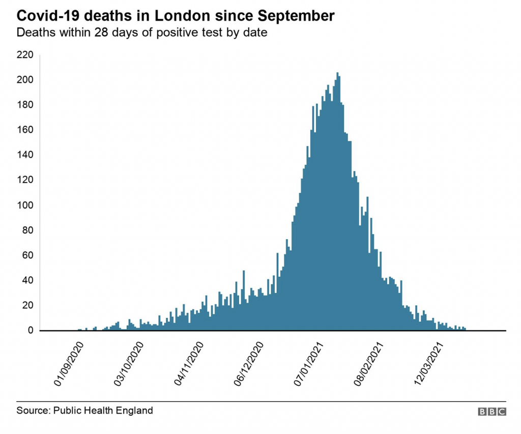 At the height of the crisis last April, about 230 deaths a day linked to the virus were recorded in London.