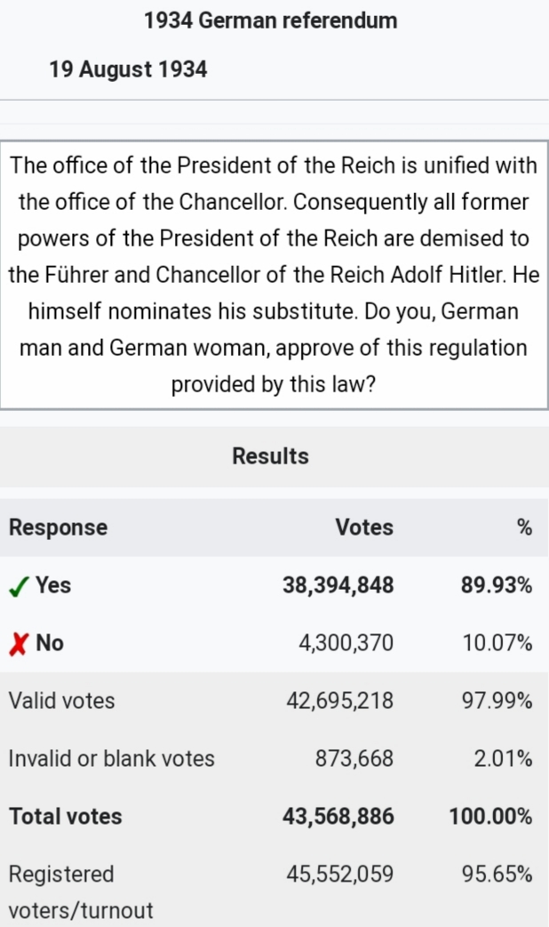 Hitler took control by manipulating the system but by and large did so legally. The German people were given a plebiscite to see if they agreed. The result is not encouraging.