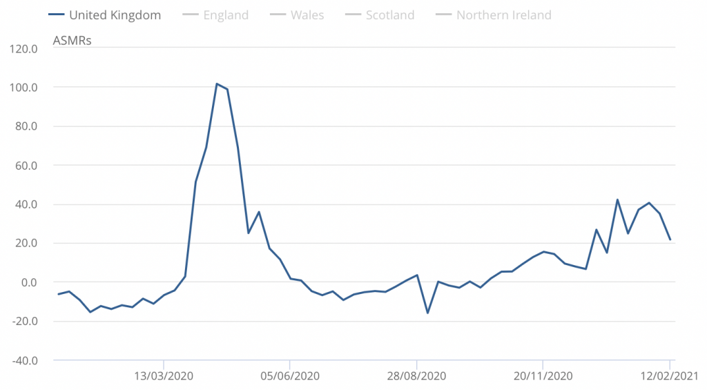 And here’s essentially the same graph for the UK as in the article (but with other European countries shown too) from the ONS publication of 19th March 2021 Comparisons of all-cause mortality between European countries and regions: 2020