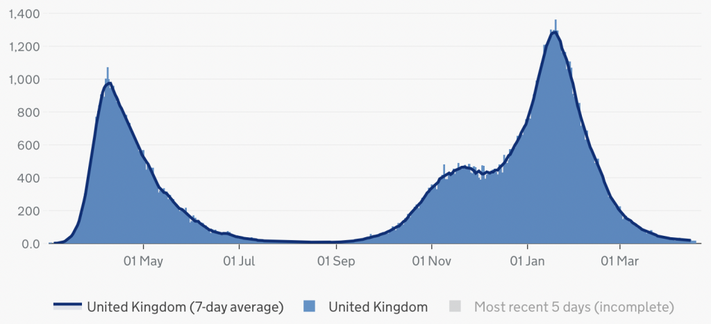 However, the chart gives a very misleading impression of the relative severity of the first and second waves. It has been claimed, for example, that the second wave was “more deadly” than the first. And in fact, if you sum the figures under each of the two curves in the chart above, you find that the total for the second wave is more than double the total for the first wave.