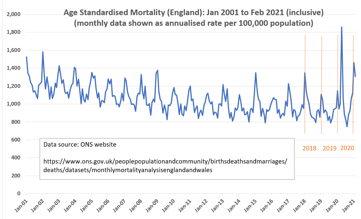 I’ve been trying to get my head round the official figures. The accumulated number of deaths attributed to Covid-19 by the Office for National Statistics (ONS) is currently about 140,000. The number of excess deaths since last April is around 112,000. (I calculated this figure using 2010 to 2019 as a baseline, but the result should be similar if 2015 to 2019 were used.) So there would appear to be 32,000 more deaths caused by Covid-19 than there are excess deaths. Or, to put it another way, had it not been for Covid-19 there would have been 32,000 less deaths in the last 12 months than the 2010 – 2019 average. 32,000 is a 6% drop in the average annual mortality compared to the previous 10 years. Quite a reduction! The ONS has stated that around 40% of the deaths in the first wave were the result of the response to Covid-19, not the disease itself. If the same holds true for the rest of 2020 and the start of 2021, and assuming that the number of excess deaths is a fair representation of the number of deaths caused by the pandemic and the response to it, the actual number… Read more »