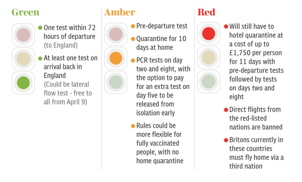 The Government has yet to announce which countries will be categorised as “green”, “amber” or “red” on its “traffic light system” when holidays resume this year.