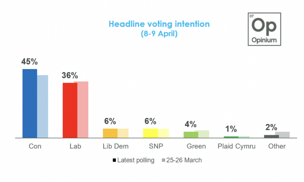 The Conservatives expand their lead to nine points, their largest lead since May last year, according to Opinium’s latest poll. The Conservatives currently have 45% of the vote (+4 from two weeks ago), while Labour have 36% (-1), Lib Dems have 6% and the Greens 4%. …