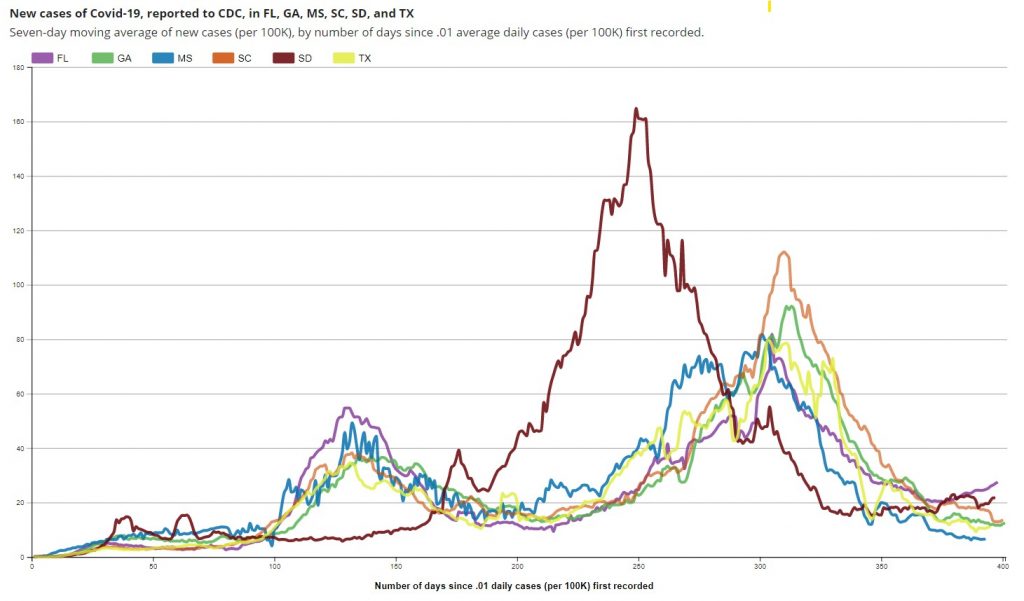 At Lockdown Sceptics, of course, we can give him several reasons for getting a move on. Florida, Texas, Georgia, South Dakota, South Carolina and Mississippi for starters. These states all currently have no restrictions at all, whether because they never had them (South Dakota), because they removed them after the first wave in the spring (Georgia and South Carolina) or in the autumn (Florida), or because they lifted them in the last few weeks (Mississippi and Texas). If lockdown is what brings infections down, what has brought them down in these states?