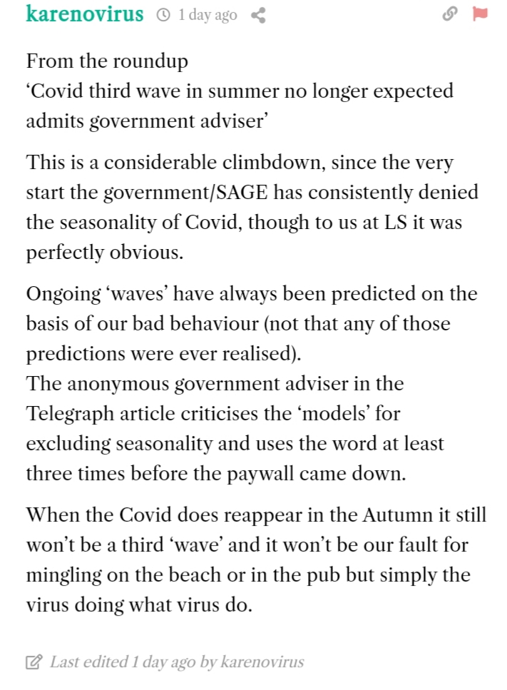 If there was one lesson which should have been learned over the last year, it is that Government is not all-powerful, and more Government isn’t the solution to every problem. You’d have thought that this wasn’t a lesson that the leader of the Conservative Party would need to learn, but then Boris Johnson is not a conservative – he is simply a principle-free zone, an opportunist looking after himself. The virus has ebbed and flowed in much the same way across the world regardless of what governments have and haven’t done, according to the seasons and the typical patterns of existing respiratory viruses. Entirely predictable for anyone with any knowledge of virology or epidemiology, or indeed anyone with a knowledge of history or who has lived through previous actual epidemics (1958, 1968). A contagious respiratory virus is always just going to do its thing. The best we can do is stay home if we are ill, protect the vulnerable, identify existing medicines which are helpful in prevention and treatment but, for the most part, carry on as normal such that the young and healthy catch the disease and we achieve herd immunity quickly so that we get the epidemic over… Read more »