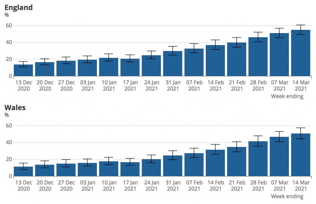 To begin with, the percentage of people with COVID-19 antibodies is now well above 50% in England and Wales, as this chart from the ONS indicates: