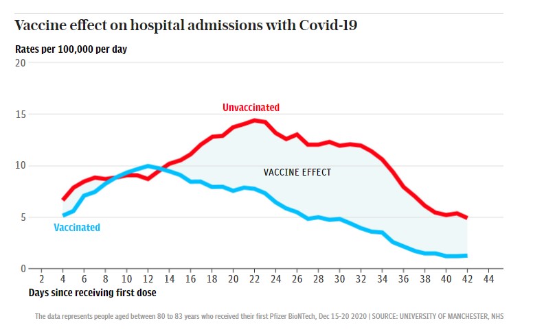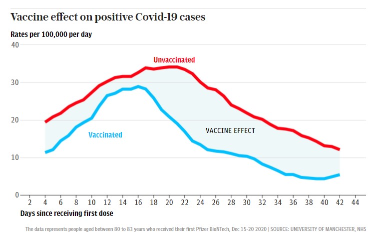 The results show that far from having little impact, the rate of Covid-related hospital admissions fell by 75% in vaccinated 80 to 83 year-olds within 35 to 41 days of their first dose of the Pfizer jab. The rate of people getting Covid dropped by 70%, with the number of positive tests falling from 15.3 per 100,000 people to 4.6. …