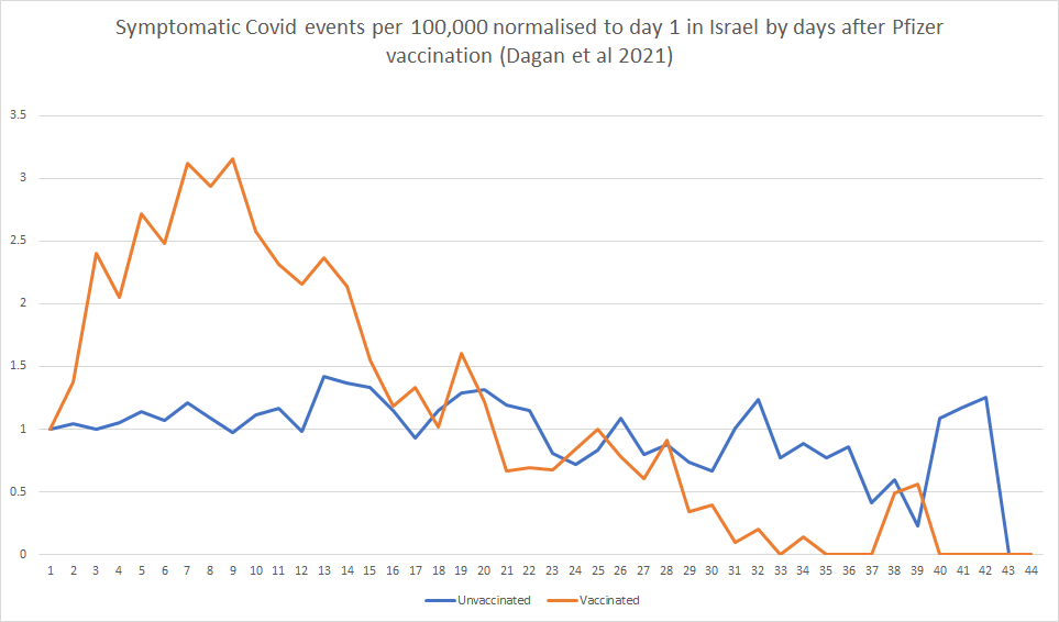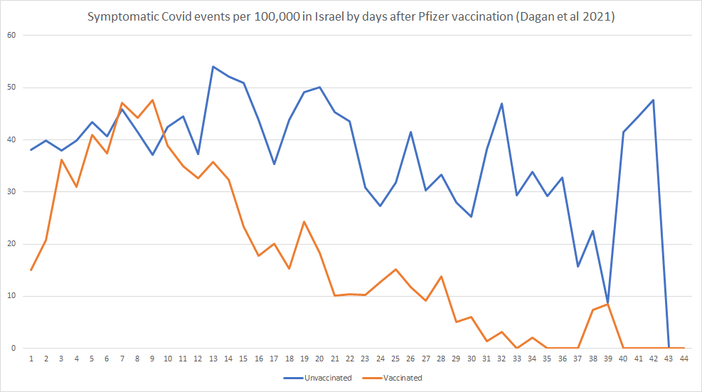This is not the only recent study to have issues like these. Another one (which also shows the vaccines being highly effective) is the large population study in Israel that appeared in the New England Journal of Medicine at the end of February. This one provides its full data tables so we can see exactly how Covid incidence changed over the study period. Below is the incidence of symptomatic Covid infections per 100,000 people by days since Pfizer vaccination (note that by the last few days of the study very few were left in it owing to most of the people in the control group having been vaccinated, making the data noisy).