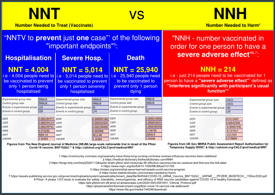 The figures I calculated are derived from the base data of the Big Pharma concealment exercise, where they quote relative risk reduction, and use those misleading figures as a justification for the vaccines. Absolute risk reduction is the same numbers put in proper context – for six weeks, six months or six years.