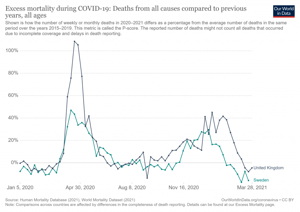 They’re very similar. And yet one of the countries has had three severe lockdowns and the other has only had voluntary or mostly voluntary measures. That tells us something I think. That lockdowns may not be a very useful tool in the long run.