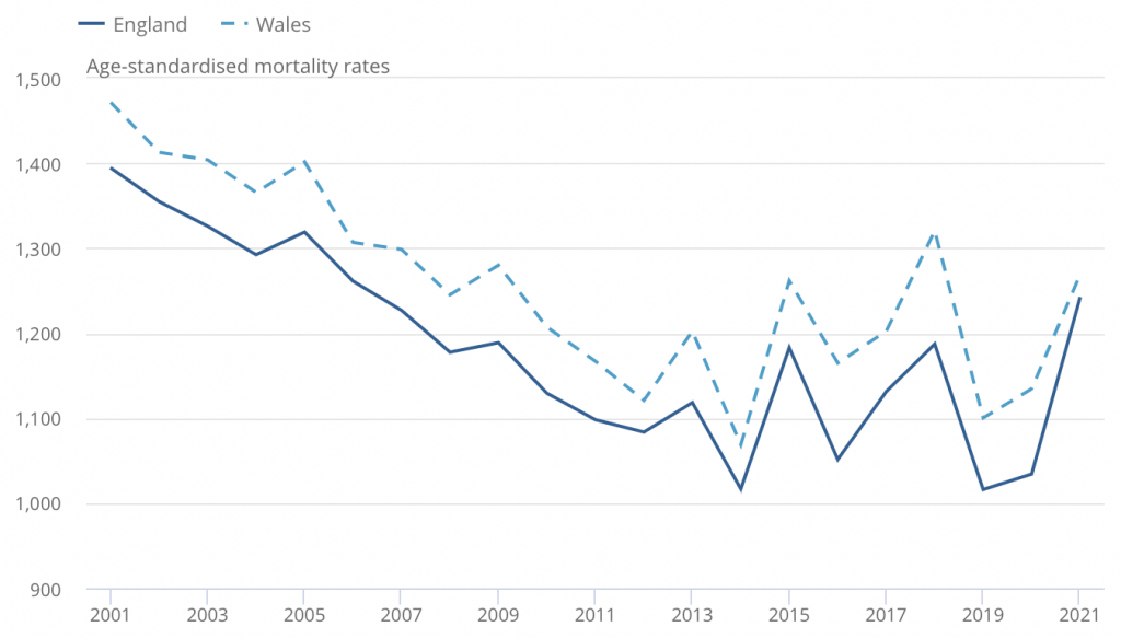 It indicates that 2021 has seen the highest level of mortality in the first three months of the year in England since 2006. However, it’s worth noting that the figure for 2021 is only 5% higher than the figure for 2018. And in Wales, the level of mortality in the first three months of the year was actually lower than in 2018.