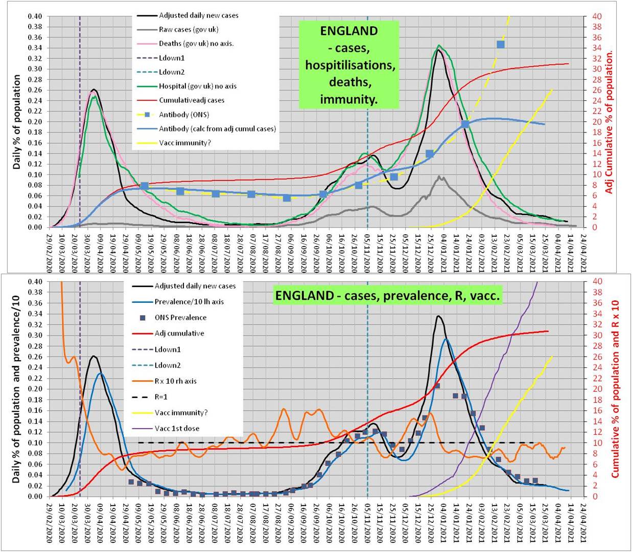 I’ll try and attach my homemade graphs for England which are probably wrong so don’t trust them. Adjusted cases are derived based on number of tests and % positive and I’ve tried to match my resultant prevalence and cumulative cases (from my adjusted cases) to ONS prevalence and antibody results. Shape of my adjusted cases seems surprisingly good match to hospitalisations and deaths, but actual values (adjusted cases) and peak prevalence seem rather high having tried to match to ONS data? R also calculated from my adjusted cases. I had to make up vaccine data between 8th December and 11th January as the UK gov data only seemed to start on 11th January?
