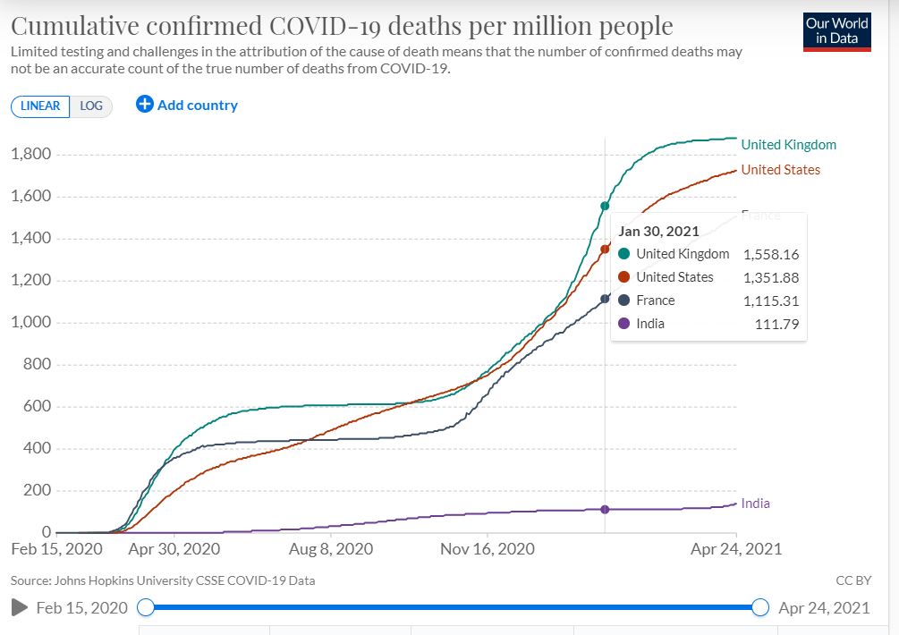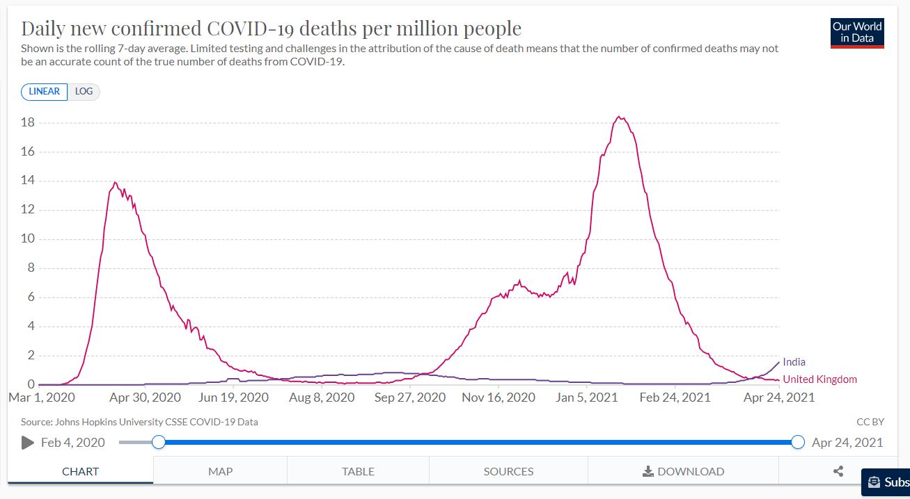 2,767 deaths in a day – equivalent to about 140 in the uk, or 1,000 in a week. For comparison, lockdown hellhole California had deaths for the week up to 18th April equivalent to over 1,200 in the UK. India total deaths are equivalent to about nine and a half thousand in the UK. Also, without wishing to offend anyone, didn’t rather a lot of people in India bathe in a polluted river recently? If tghe UK can have an NHS crisis every year, I dare say India, with rather lower per capita wealth despite the advances they have made, are more than capable of having crises in their health provision.