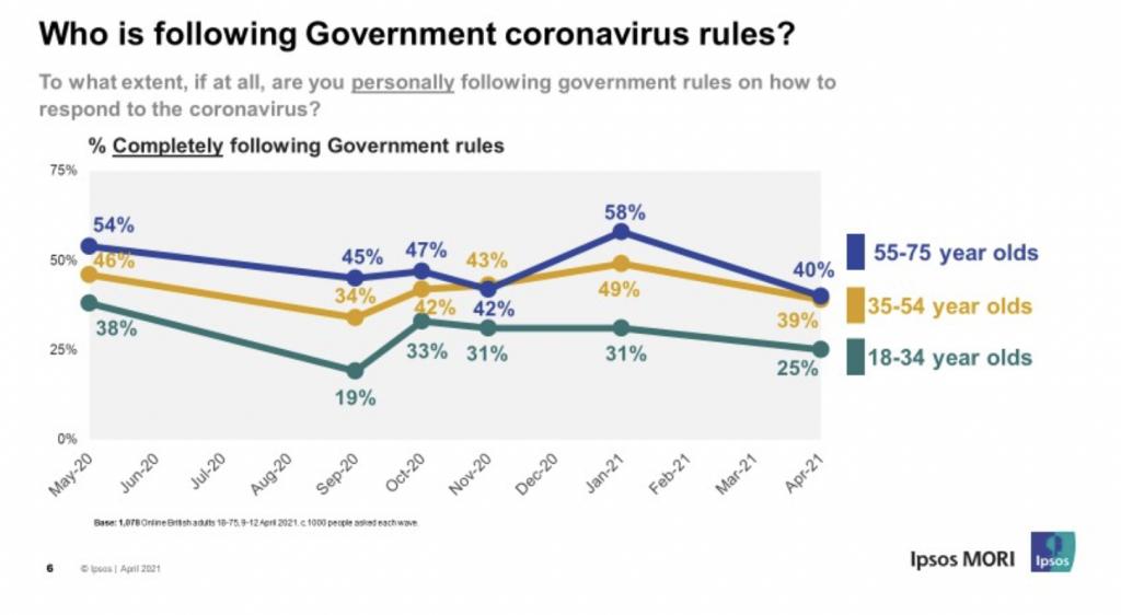 Compliance with Covid restrictions has fallen to levels not seen since last autumn, with a particular drop among those who’ve recently been vaccinated, according to the results of a new Ipsos MORI survey. Six in 10 people aged 55-75 say they are not completely following the rules. Covid vaccine uptake in this age range recently hit 95% and 12 million people (also mostly within this bracket) have had two doses. The Ipsos MORI survey found that while compliance has fallen the most in recent months among those aged 55-75, this age group is still more likely than others to claim to be following the rules relating to Covid. Here are the key findings.