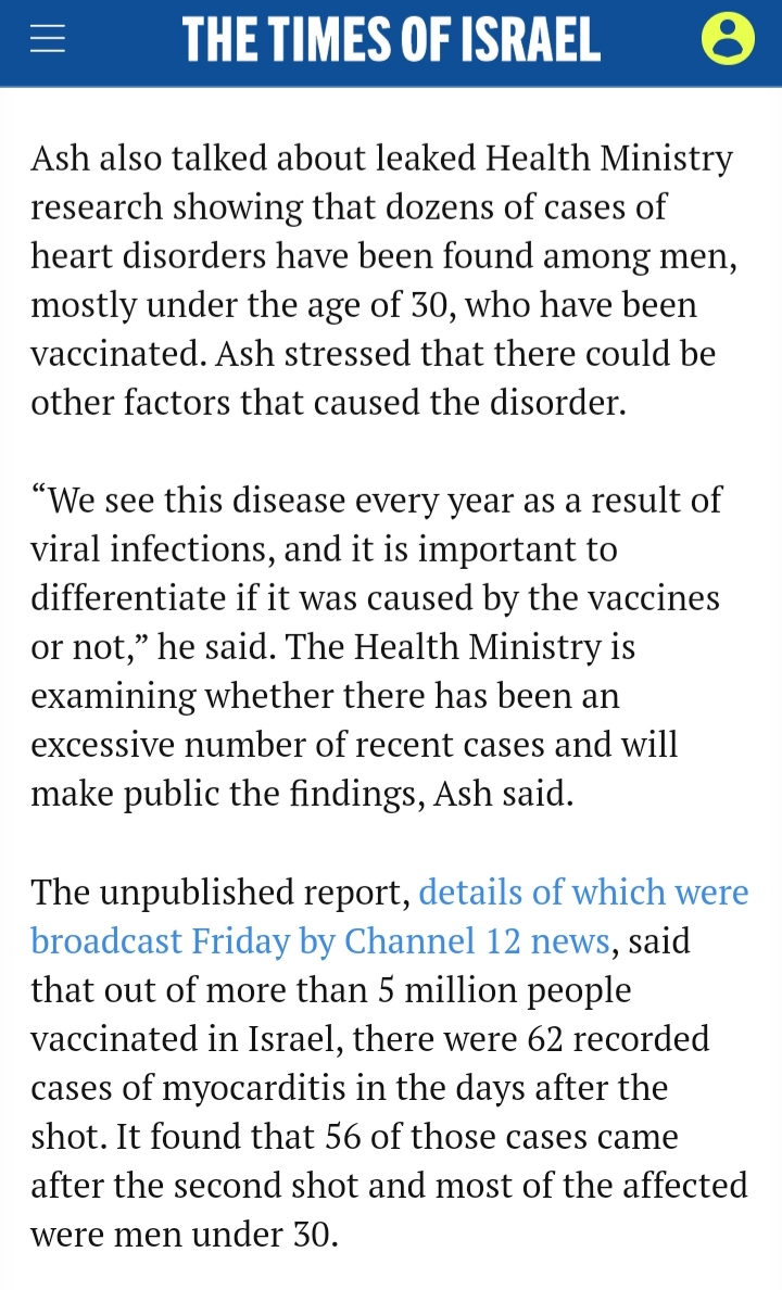 Tucked away in that Times Of Israel piece is the attached. It discusses an apparent outbreak of heart disorders among young men (>30) who have recently been vaccinated.