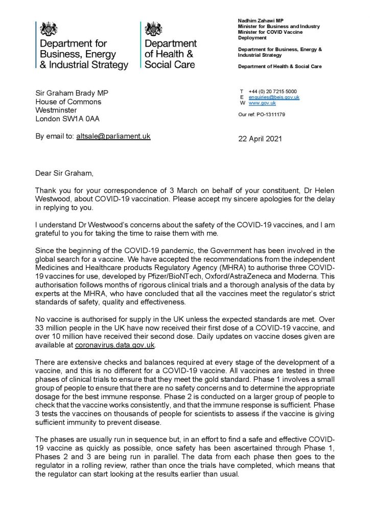 Dr Helen Westwood, a GP whose previous letters and comments have appeared on Lockdown Sceptics, wrote to her MP Sir Graham Brady in March with some concerns about the vaccines and the potential for coercion. She has now received a reply from Vaccines Minister Nadhim Zahawi that is far from reassuring.