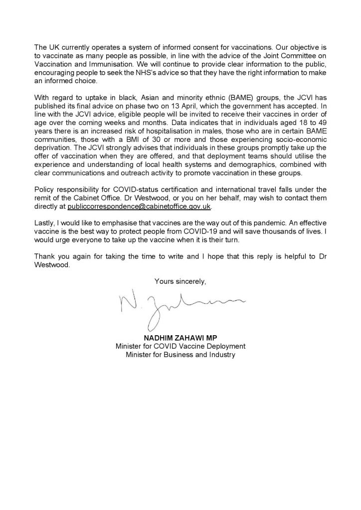Thank you for sending me the letter you received from Nadhim Zahawi MP, Minister for Business and Industry & Minister for COVID Vaccine Deployment in response to the representations you made to him on my behalf. I have attached his letter and my original email.