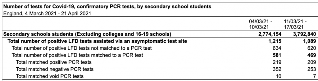 It is interesting that they assume confirmation from a PCR test defines true and false positives, even though PCR tests are more sensitive than LFTs so are no less likely to give a positive from fragments or contamination. What if in some cases the PCR tests are just confirming the false positive of the lateral flow tests?