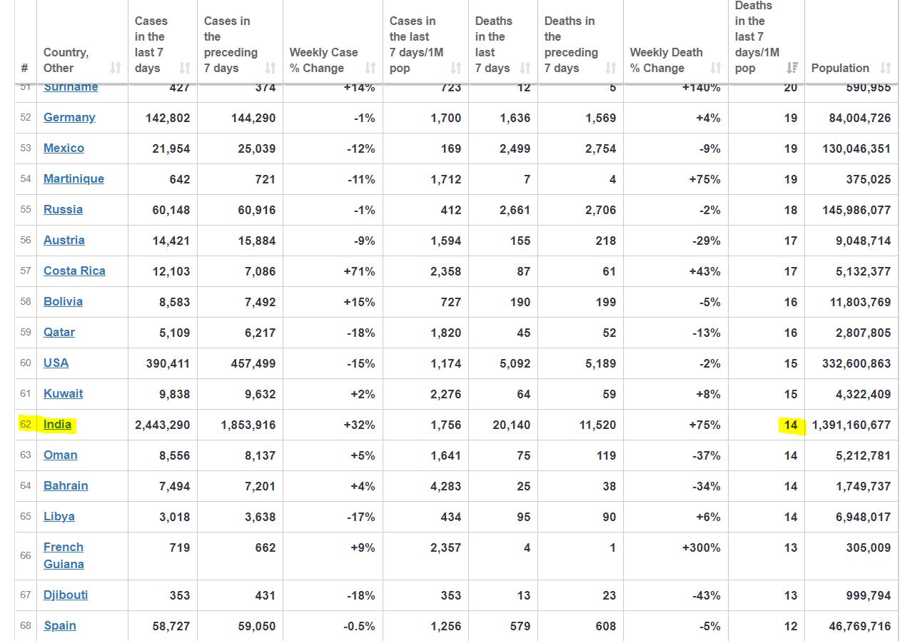 covid ‘deaths’ in India 2000 per day. Barely a rounding error in a population of 1400 million and 27,000 all cause daily deaths