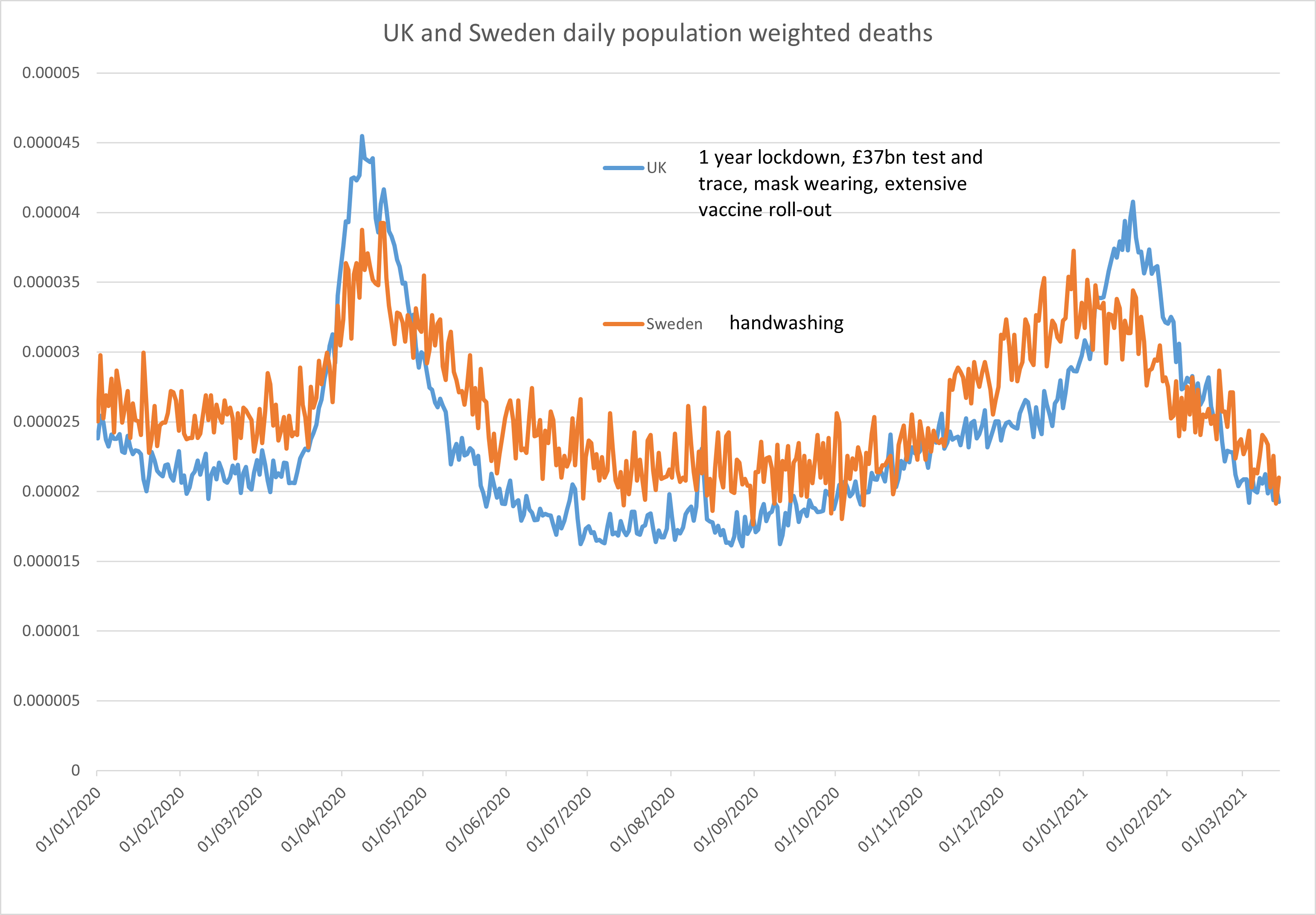 The first peak suggests the beginning of a decline in the normal autumn surge. There is then a steep uptick that correlates pretty well with the spread of the ‘vaccines’.