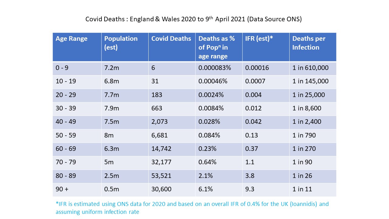 The table below is a calculation of estimated mortality risk. I calculated this based on an overall UK IFR of 0.4% using the 2020 ONS mortality figures for England & Wales and assuming a uniform infection rate across the age ranges. Given that over 80% of deaths, at least, are people with significant co-morbidities then you can reduce that risk by a factor of at least 4 – so a 1 death per 25,000 infections becomes a 1 in 100,000 for a healthy person in that category.