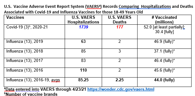 In this picture above is included bout 160 million dodes of flu vaccine yearly and the spike above comes with the C-19 vaccine.In the age group 18-49 C-19 vaccine is 80 times more deadly than flu vaccine. The VAERS reporting system has not changed this year. This is clearly more dangeous vaccine than flu vaccine and should be used in those with severe outcome of C-19 including in the age group cited for the few in risk groups.