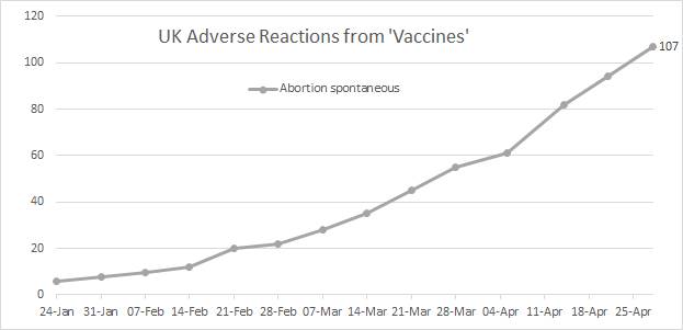 So far, there has been a count of 107 ‘abortion spontaneous’ in the jab programme with 5.9 million under 45s having taken the 1st jab and 1.9m having taken the 2nd jab. Deaths per jab so far is 1 in 43,682.