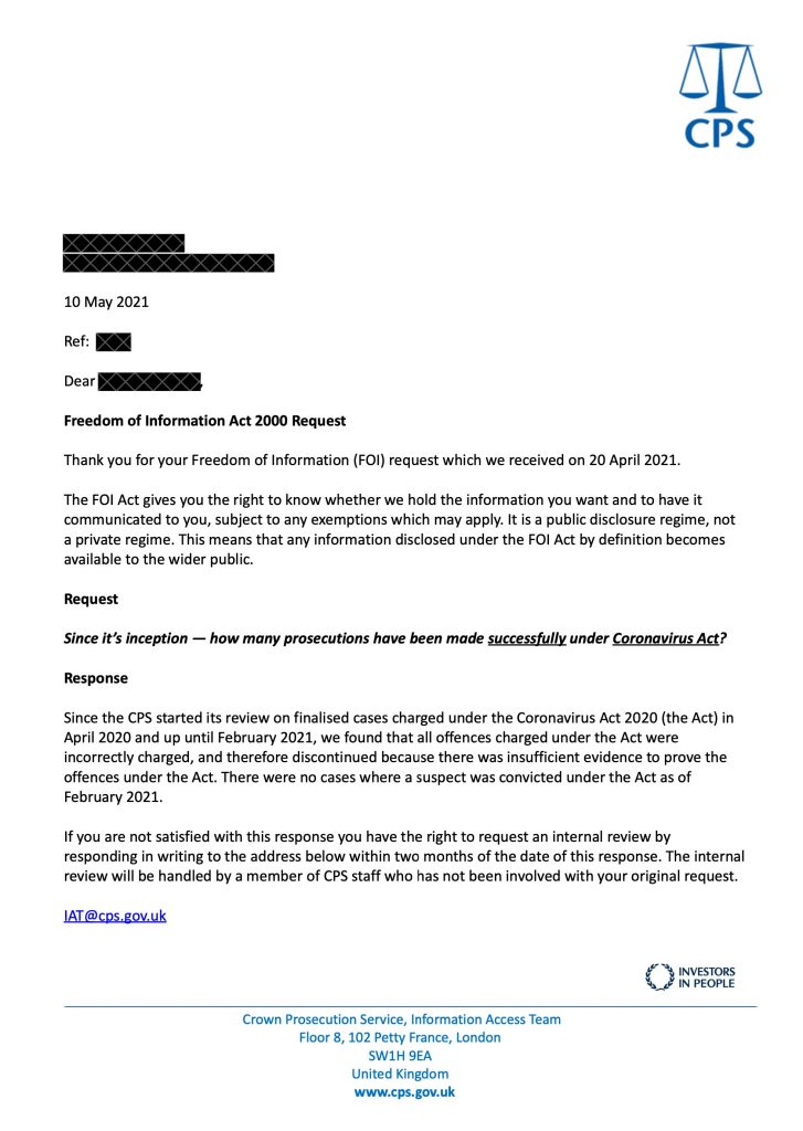 CPS Admits That “All Offences Charged Under the Coronavirus Act Were Incorrectly Charged”