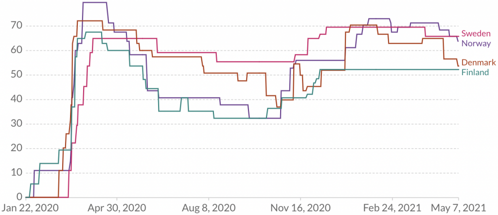 Yet if we look again at the Blavatnik School’s database, it’s very difficult to pin Sweden’s higher death rate on the lack of restrictions. As a matter of fact, Sweden had more restrictions in place than Denmark and Finland for most of the winter. Here’s a graph showing the overall stringency index in each country. (The index is far from perfect, but it gives you a general sense of what happened.)