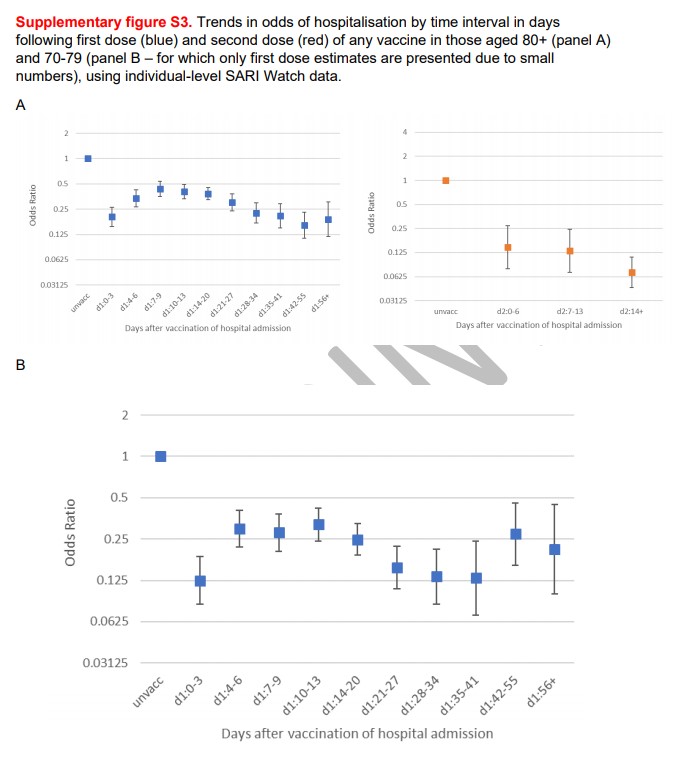 These translate to a relative risk reduction of 82% for 70-79 year-olds and 80% for 80+ year-olds after one dose, and 81% for 80+ year-olds after two doses. These are all strangely similar figures when one would expect more differences between the age groups and between being partially and fully vaccinated. It’s not clear the extent to which the declining viral incidence during the study period has been taken into account by the researchers, particularly the fact that the cases among the vaccinated will tend to be from later in the period when viral incidence was lower.