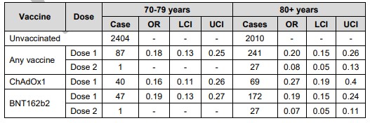 Among 70-79 year-olds it finds 4.0% (1,147/28,875) of unvaccinated cases died versus 2.7% (15/549) for Pfizer 1, 2.1% (10/484) for AZ 1 and 0% (0/7) for Pfizer 2. This corresponds to unadjusted relative risk reductions of 33% (Pfizer 1), 47% (AZ 1) and 100% (Pfizer 2).