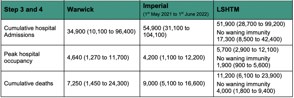 Even more damning is how the models previously assumed that a vaccinated person who became infected contributed just as much to transmission as an unvaccinated person who became infected. Clearly, a vaccinated person will have antibodies and an immune response primed to fight the virus, meaning that if infection does take hold it will be fought off more quickly, thereby reducing the total period of time a person is infectious and their peak infectiousness during that period. This is basic biology, but it took a new study quantifying the effect before the teams were prompted to take this into account. This seems naive at best. Ironically, despite the latest data, the LSHTM team still chooses to ignore it and has continued to assume that vaccinated people will contribute as much to transmission as the unvaccinated. Hence, LSHTM’s comparatively elevated estimate of deaths (see below).