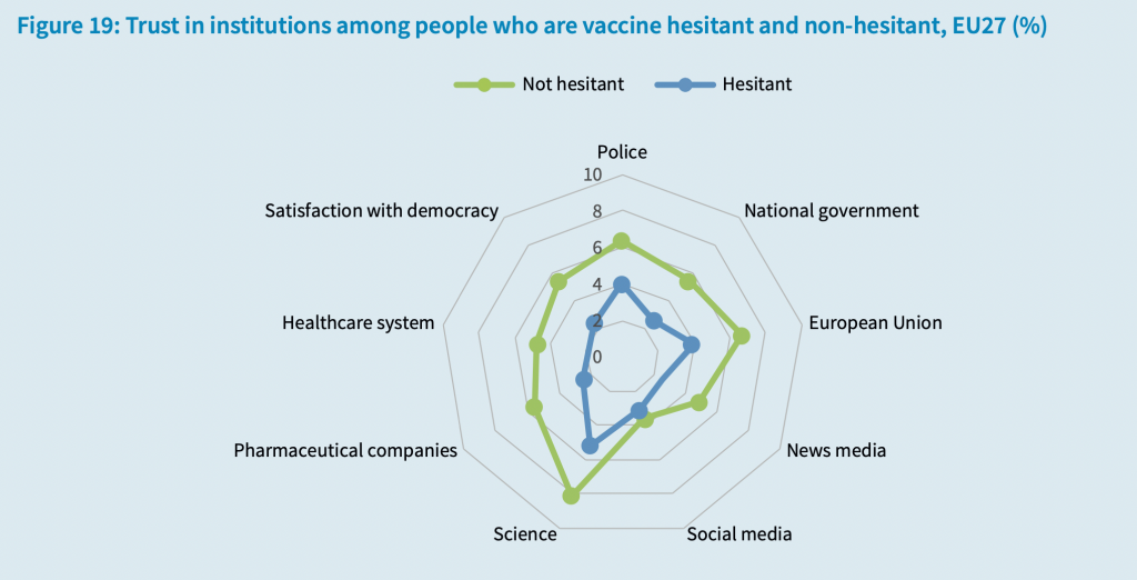 Trust in the news media, pharmaceutical companies, national government and national healthcare system is lower among the hesitant than the non-hesitant. Use of social media as a primary source of news and information is identified by the survey’s authors as bearing a “strong association [with] vaccine hesitancy”, despite the fact that the non-hesitant report as being more trustworthy of social media (albeit only marginally).
