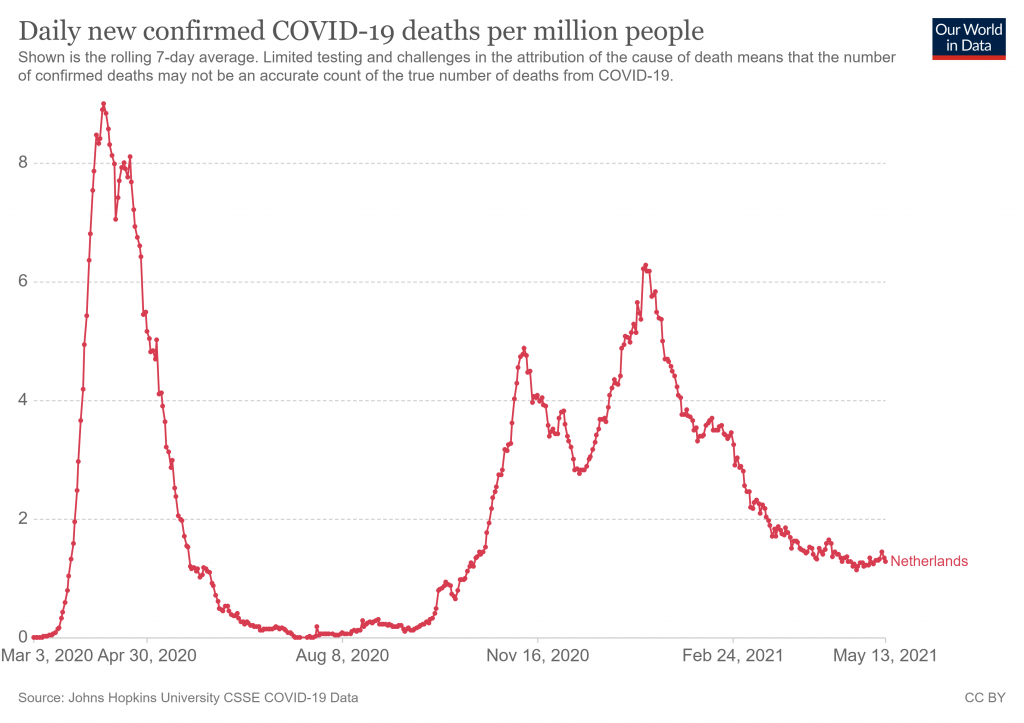 Hoogeveen doesn’t indicate how this model has fared in 2021 so far, though week 10 or even week five doesn’t appear to line up with the Covid peak in the Netherlands this winter (see below). It would be interesting to know the pollen concentrations over this time, and Hoogeveen’s thoughts about this.