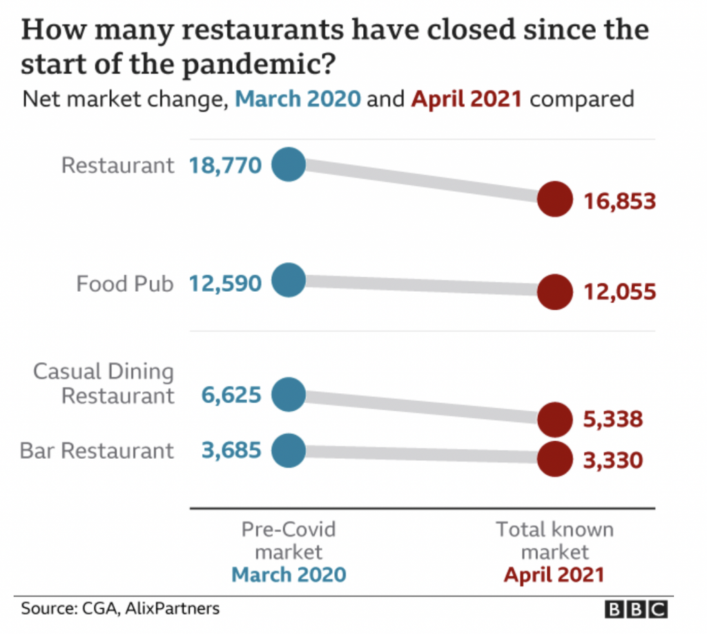 Restaurants will be able to reopen for indoor service from Monday, but only if lockdown hasn’t already forced them to close for good. There are now 9.7% fewer restaurants – and 19.% fewer “casual dining venues” – across Britain than in March 2020, according to new research. BBC News has the story.