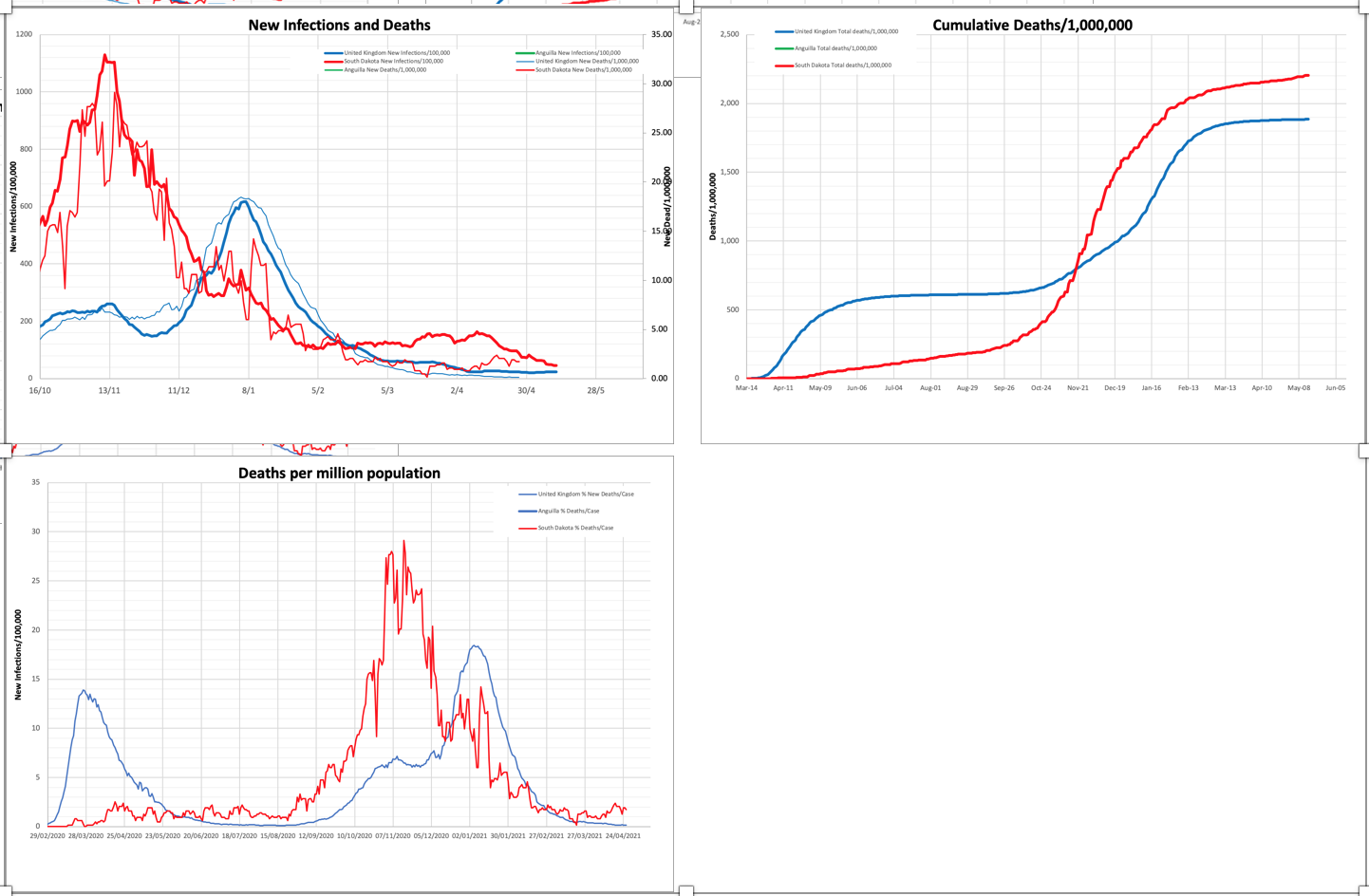 Graphing cases and deaths for South Dakota (population about 900,00) and the UK (population about 68 million), does not seem to show any effect of the vaccines (given all caveats for causality, reporting, bla, bla, bla… and whatever). At least I can’t see it from this data set. Specifically: 1) The deaths seem to correlate with cases (by the way this is certainly not the case for Sweden, something strange going on there). 2) South Dakota had a high case rate peak about 2 months earlier than the the UK and peaking about 2 months earlier than your investigated time frame. So it is hardly surprising that the UK death rate you have calculated exceeds that of South Dakota. 3) The base UK death rate, and even the peak rates, are remarkably similar to South Dakota (although the UK had a peak early on and as detailed above the later peaks are offset). 4) The cumulative reported deaths for South Dakota and the UK are really quite similar (actually 1885/million for the UK and 2205/million for South Dakota). So it looks like what I assume to be the relatively tough cow-boys/girls/* who did not lock down came away nearly just… Read more »