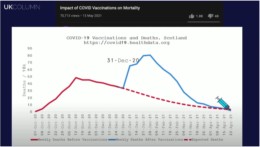 This same steep post vaxx rise in deaths has been in many countries, and was featured in today’s UK Column shown against an extrapolation of pre-vaxx deaths. This section starts at 16m40s, but I advise watching the program from the start as it cover vaxx adverse events in some detail