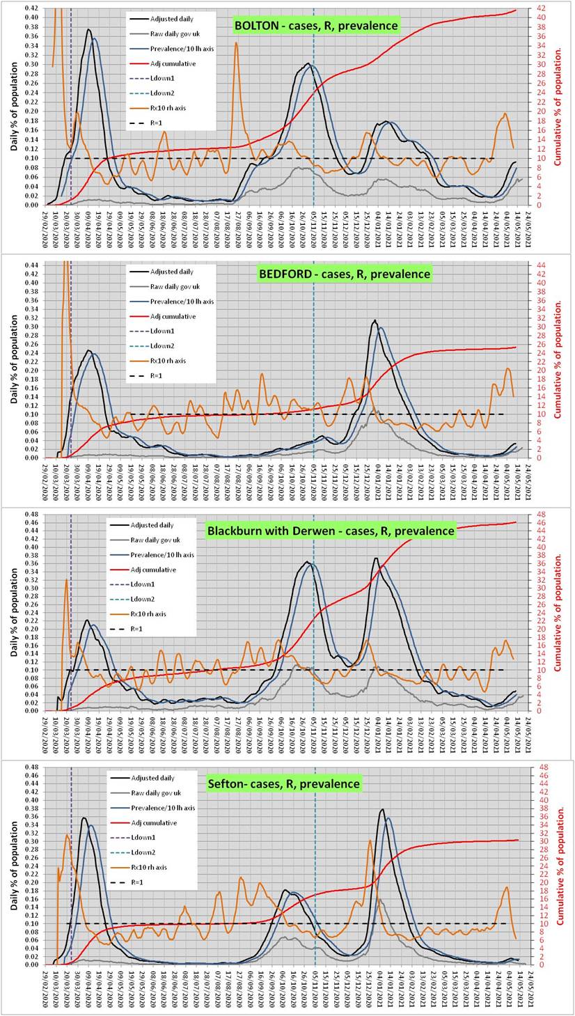 Attached, my latest homemade graphs for Bolton, Blackburn, Bedford and Sefton updated shortly after 4pm today, don’t trust them, I could be completely wrong. My values for the population of each area may be out too, but hopefully the trends are about right. I think testing has increased in most of these areas recently. The black line is my attempt to adjust cases taking into account number of tests and % positive. I’m calculating R (orange line) from my adjusted cases line (ratio of cases +/- 3 days). Because of the way my method works I’ve only been able to calculate R up to about the 10th May and we’re 11 days on from that now and we’re about 8 days on from my adjusted cases lines.