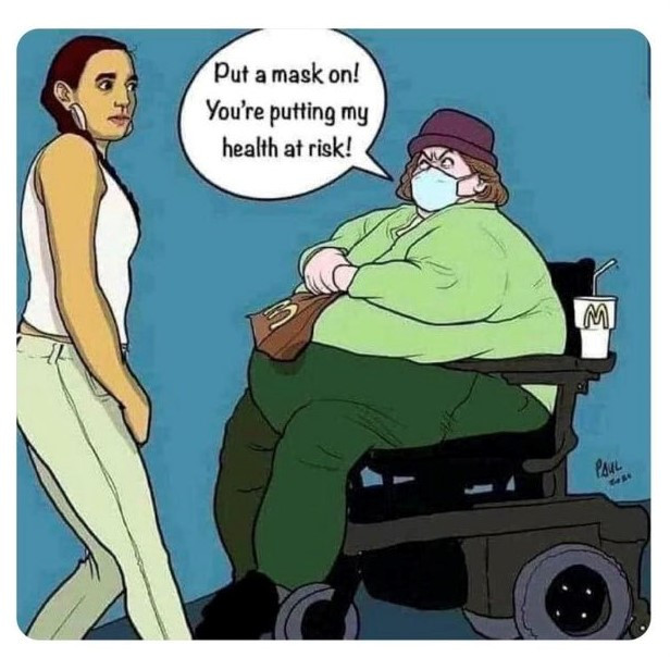 Exactly. Last year, I was near 25 BMI (yes I know that’s a flawed measure) and my waistline was really not good. During the first lockdown, I stopped eating processed foods and cut back on carbs. I lost 14 kg and now have a BMI around 19. It’s called taking responsibility for your own health. During that same period, my now ex-landlord sat in the lounge eating biscuits and watching TV while complaining about other people not wearing masks properly or getting the jab. She’s gained at least 10 kg and still expects other people to be responsible for her health.