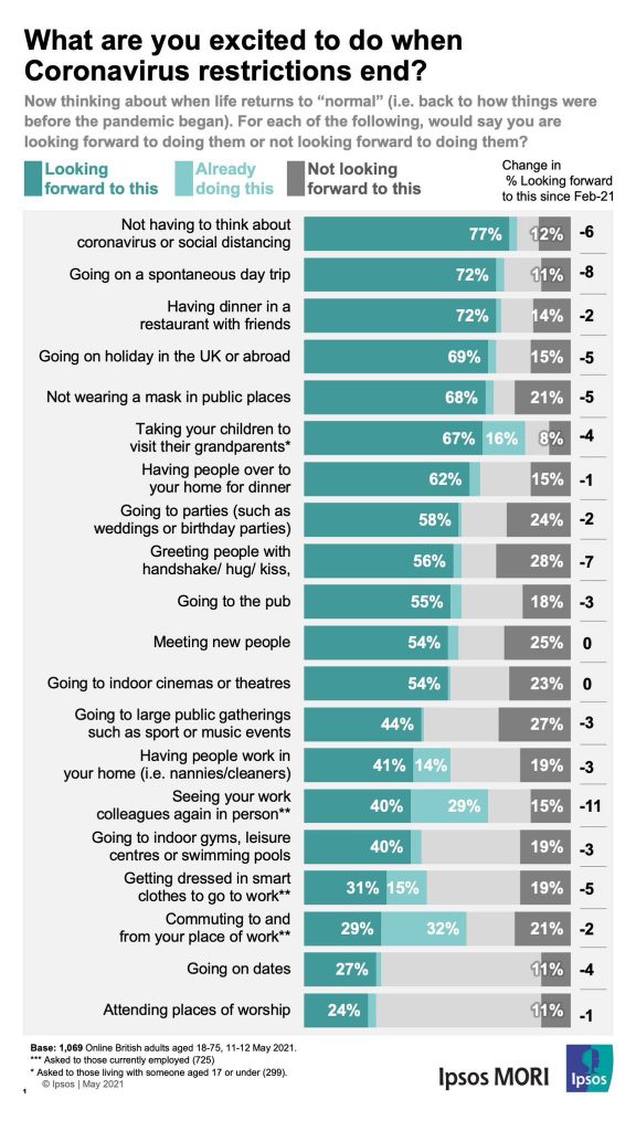 Stop Press: New polling from Ipsos MORI suggests it may be more than 20% of the population that’s suffering from Covid Anxiety Syndrome. It shows that 28% of British adults aren’t looking forward to “Greeting people with handshake/hug/kiss”, 27% aren’t looking forward to “going to large public gatherings such as sport of music events” and 24% aren’t looking forward to “Going to parties (such as weddings or birthday parties)”.
