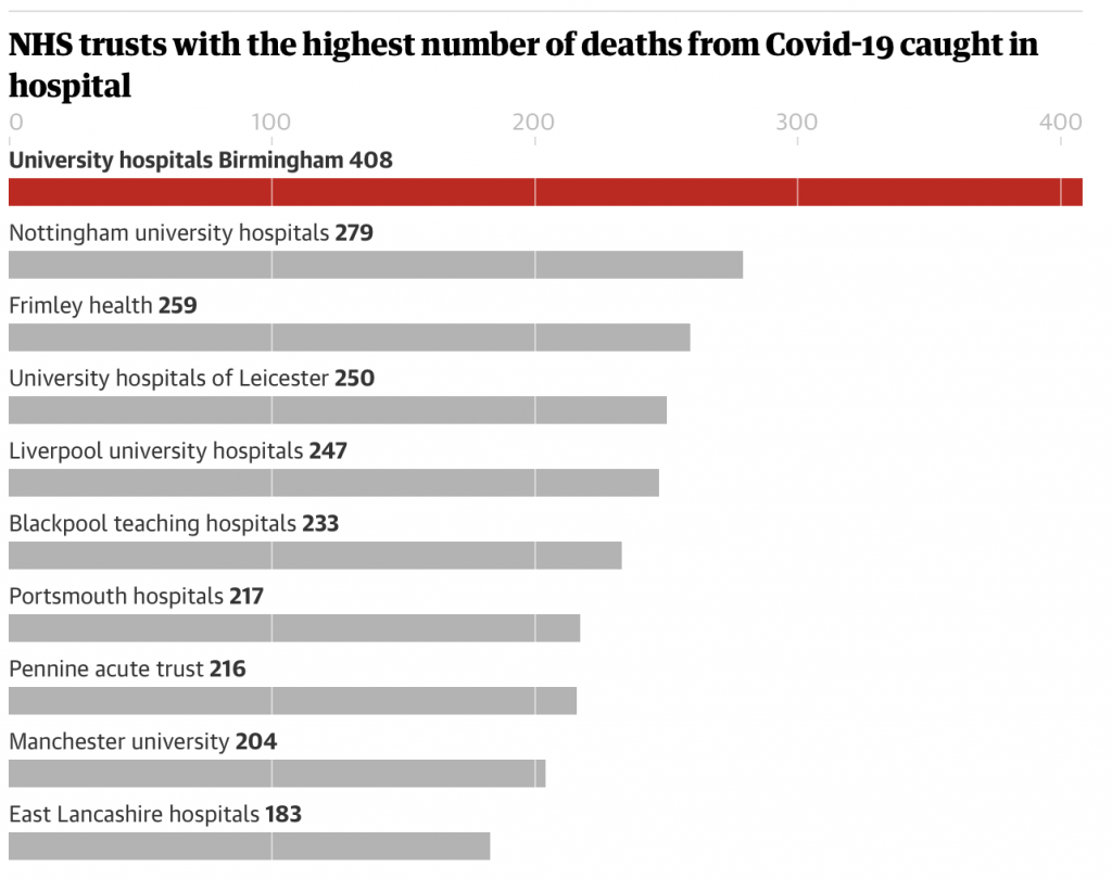 According to the FoI responses, University Hospitals Birmingham trust had the highest number of deaths (408), followed by Nottingham University Hospitals (279) and Frimley Health (259). Nine trusts had 200 or more deaths.