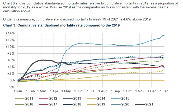 Chart 3 of the week 19 monitor shows mortality rates compared to 2019. This is consistent with the calculation of excess deaths in the pandemic mortality monitor.