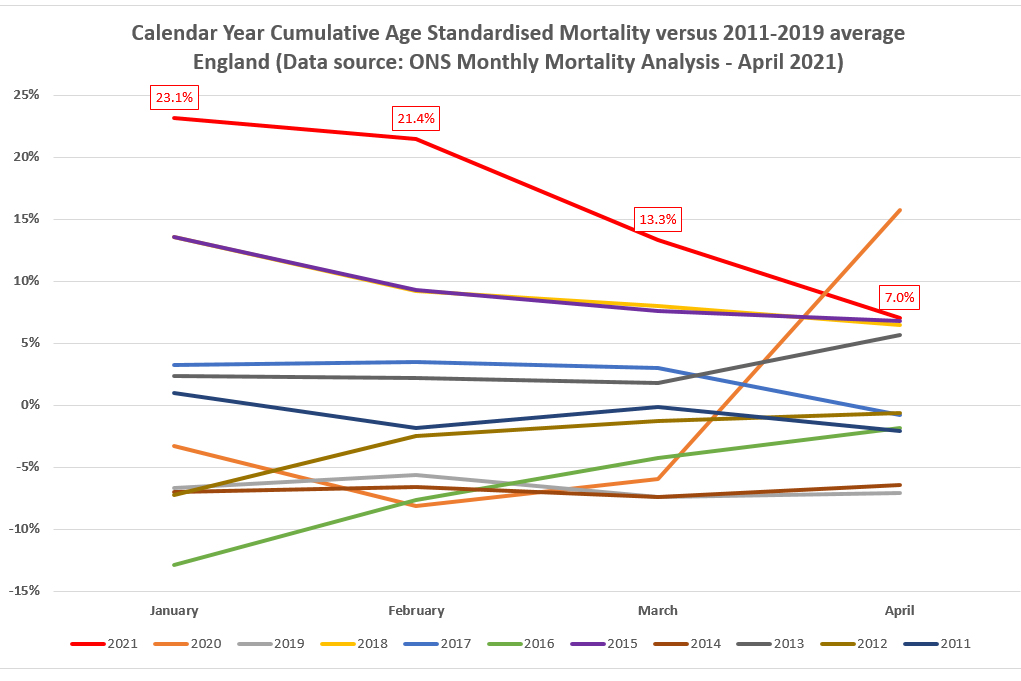 Hard to see how any objective analysis would compare to 2019. 2019 is the lowest January to April cumulative Age Standardised Mortality for England for any year for which data is readily available (back to 2001) and probably ever.